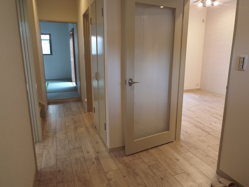プッシュ型のドアノブも交換その他、壁紙の張り替え、照明をダウンライトに変更、カーペットをフロアタイルに変更しました。